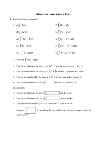 Worksheet of questions to find the area under a curve. Also, this can be done without transforming the integration limits and returning to the initial variable. Think parentheses and denominators 2.find du dx 3.rearrange du dx until you can make a substitution 4.make the substitution to obtain an integral in u Calculate the definite integral by change of variable. The following is a list of worksheets and other materials related to math 129 at the ua.